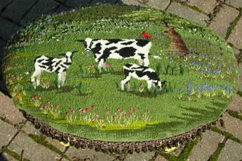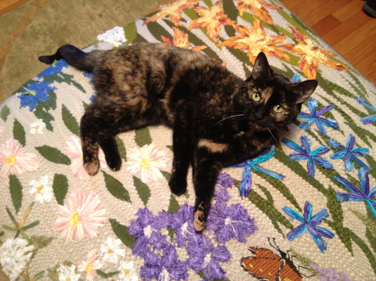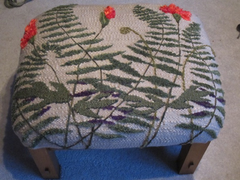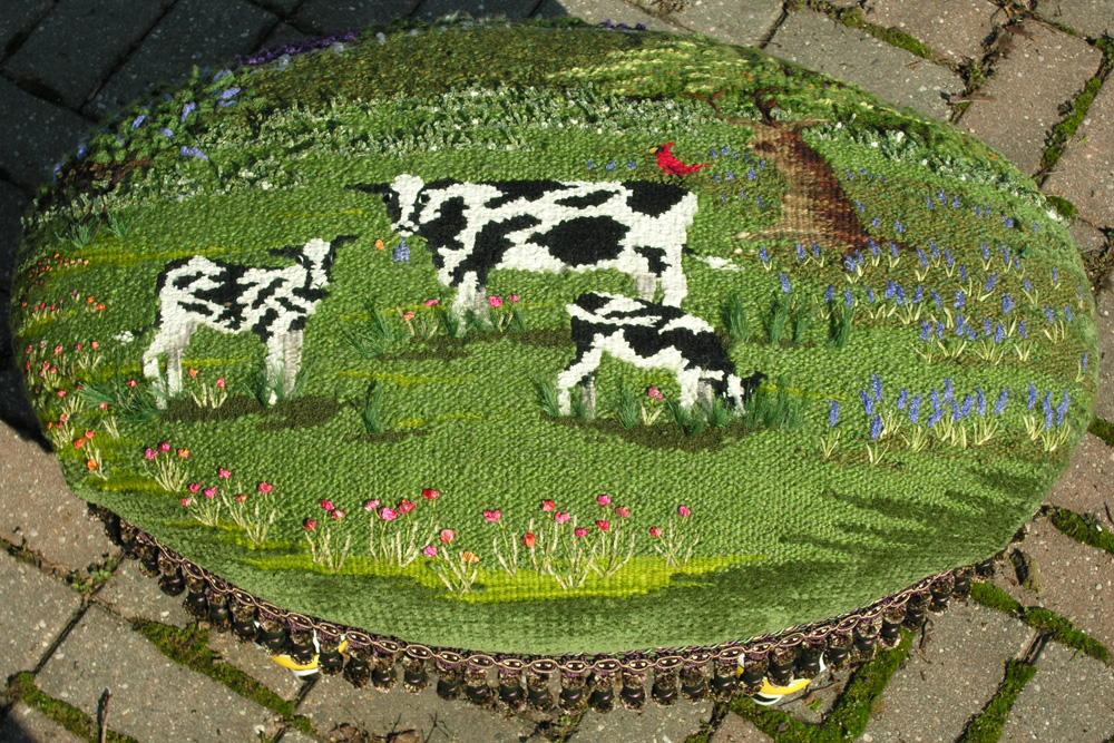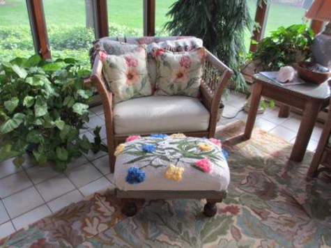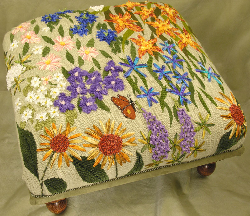 "My husband and I had been looking for a large ottoman for some time. When we happened upon Lisa and Cris Berry's booth at an (art) fair we were so impressed with the beautiful designs and craftsmanship. There was nothing as large as what we wanted, but Lisa offered to make something to our specifications. When I mentioned that I love flowers and gardening, she suggested I email some of my garden photos. The design and color palette she came up with based on my photos was amazing. We were totally pleased with the finished piece and enjoy using it every day."