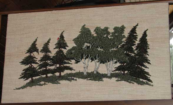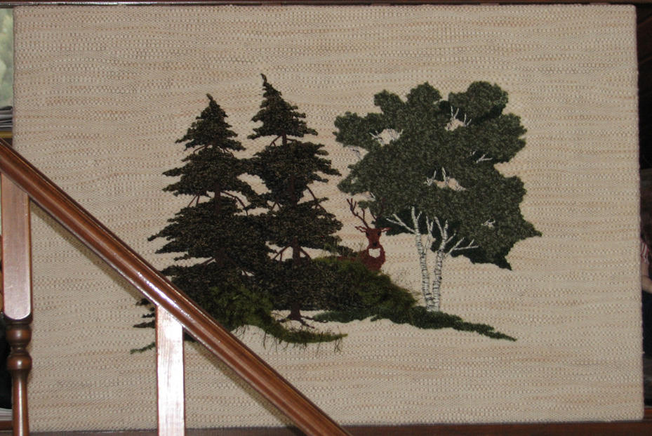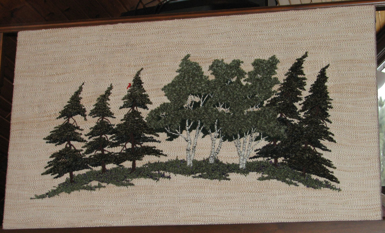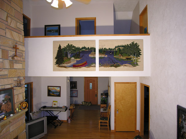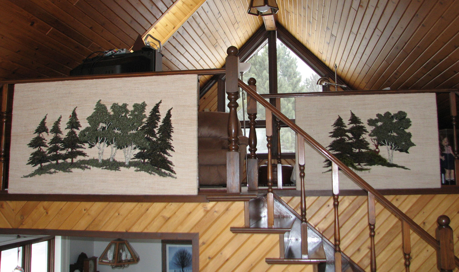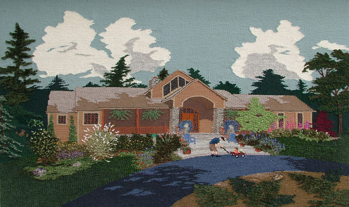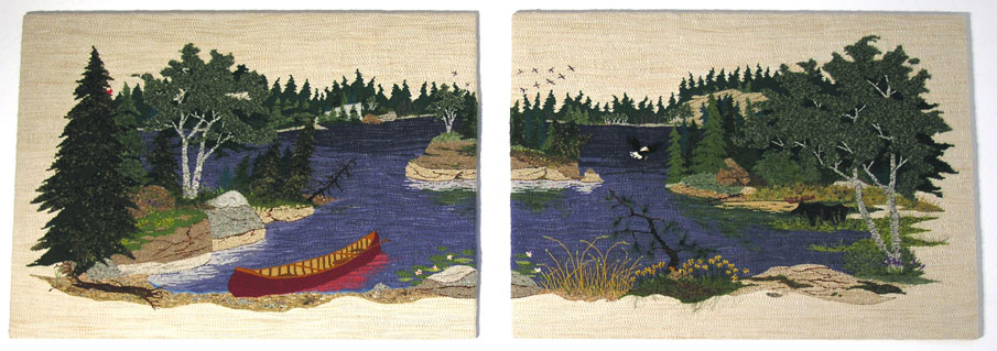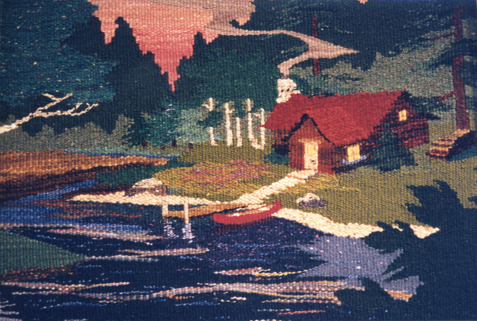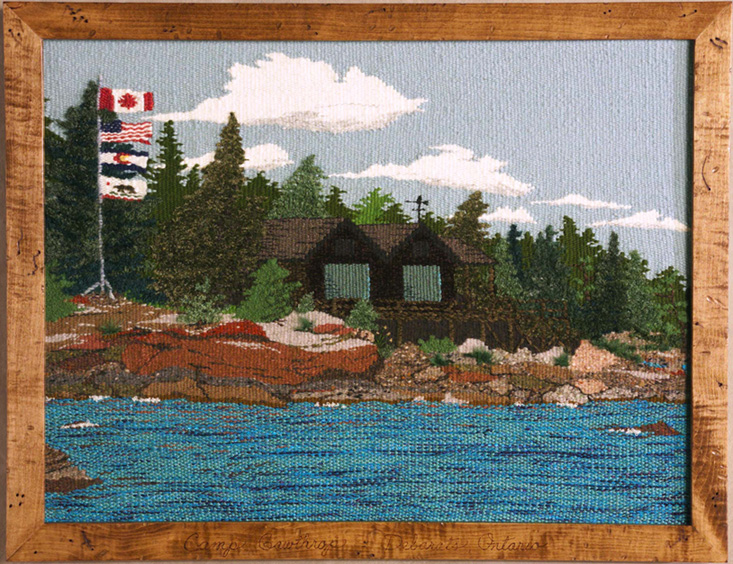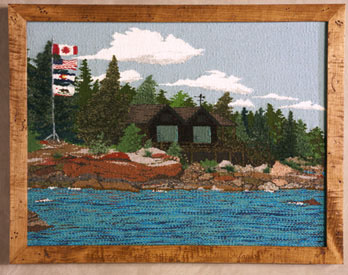 The footstool was adored by all of the Palmers, including Arnold’s fiancé, Kit Gawthrop. Gawthrop was so impressed by Motherloom Studios’ extraordinary work she commissioned Lisa and Cris to create a tapestry wall hanging for her children. Palmer’s fiancé requested the subject of the wall hanging to be “Gawthrop Camp”, a family owned cabin, located on an island in Desbarats, Ontario, that was razed earlier this year. Gawthrop wanted to preserve memories of the cabin and its surroundings for her children. The 36”x28” tapestry wall hanging was completed in December 2004 and proudly resides in the Gawthrop private collection.