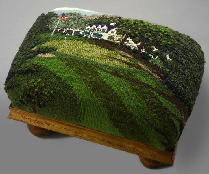 After extensive research and guidance from Palmer’s daughter, an impression of the 18th hole at Latrobe Country Club (Latrobe, PA) seemed the perfect subject matter for his footstool. "Latrobe holds special significance for Mr. Palmer and his family," explains Berry. "Latrobe is his birthplace and he has been the sole owner of the country club since 1971." When complete, the fully functional Motherloom footstool included a handcrafted wooden base embellished with a personalized message from the Palmer family.